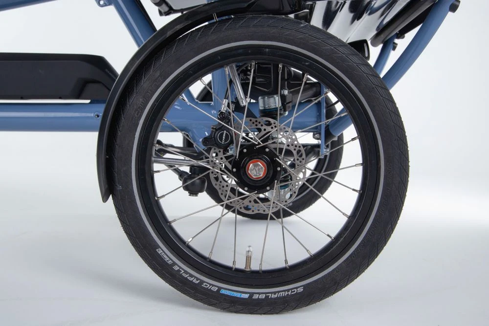 Hydraulische Tektro-Scheibenbremsen an allen drei Rädern. Absolute Kontrolle in allen Verkehrssituationen. Vorderbremse mit Parkfunktion für einfaches, ständerloses Abstellen und sicheres Ein- und Aussteigen Deiner Kinder.