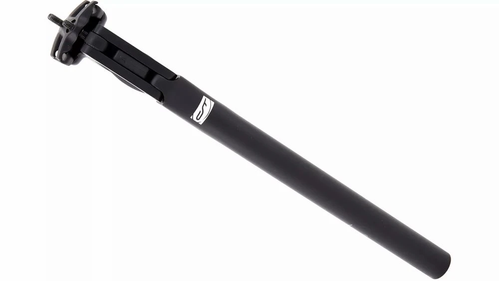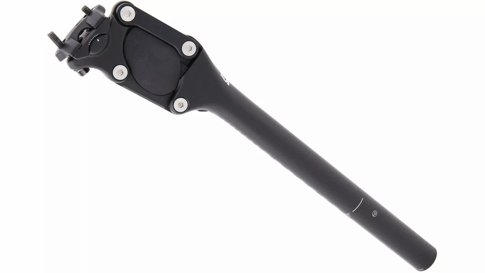 Die schmal geschnittene Parallelogramm-Federsattelstütze ist aus Aluminium gefertigt und besitzt einen erweiterten Federweg von 36 mm. Ein Fahrergewicht von 70 bis 85 kg erweist sich hier als optimal. Mithilfe von Austauschfedern federt die Sattelstütze aber auch bei einem Fahrergewicht von 50 bis 70 kg, von 85 bis 100 kg oder von 100 bis 130 kg optimal.