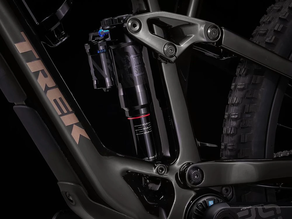Außerdem eine RockShox Lyrik Select+ Federgabel mit 150 mm Federweg, DebonAir-Federung und Charger 2.1 RC Dämpfung sowie einen RockShox Super Deluxe Select+ mit 140 mm Hub.